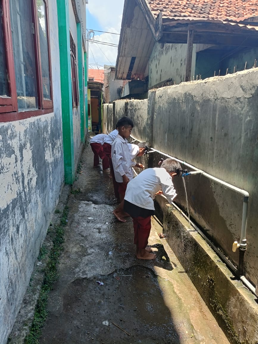 Suasana tertib dan penuh semangat terlihat di halaman dekat mushola SDN 21 Tolomundu saat siswa-siswi kelas 4 bersiap melaksanakan sholat Dzuhur berjamaah. Sebelum masuk ke mushola, mereka dengan mandiri mengambil air wudhu, sebagai bentuk persiapan ibadah yang telah menjadi rutinitas harian di sekolah.