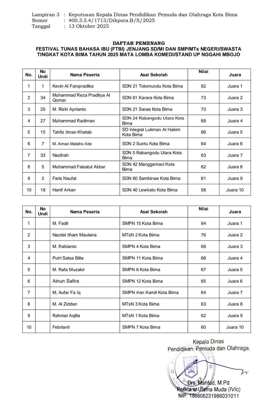 Selamat kepada siswa dan pembina FTBI Tingkat Kota Bima tahun 2025. Alhamdulillah dalam Lomba Stand up comedy yang diikuti oleh anakda Kevin Al Farapradika dan guru pembina pak Ini Elfian ,S. Pd meraih juara 1 dan lanjut ke tingkat Provinsi . Dan Lomba tembang Dali oleh anakda Muhammad Wildan dan guru pembina Ibu Sarinah ,S. Pd meraih Juara 7. Terimakasih kepada bapak/ibu guru pembina dan Siswa-siswi yang telah ikut dalam lomba FTBI Semangat