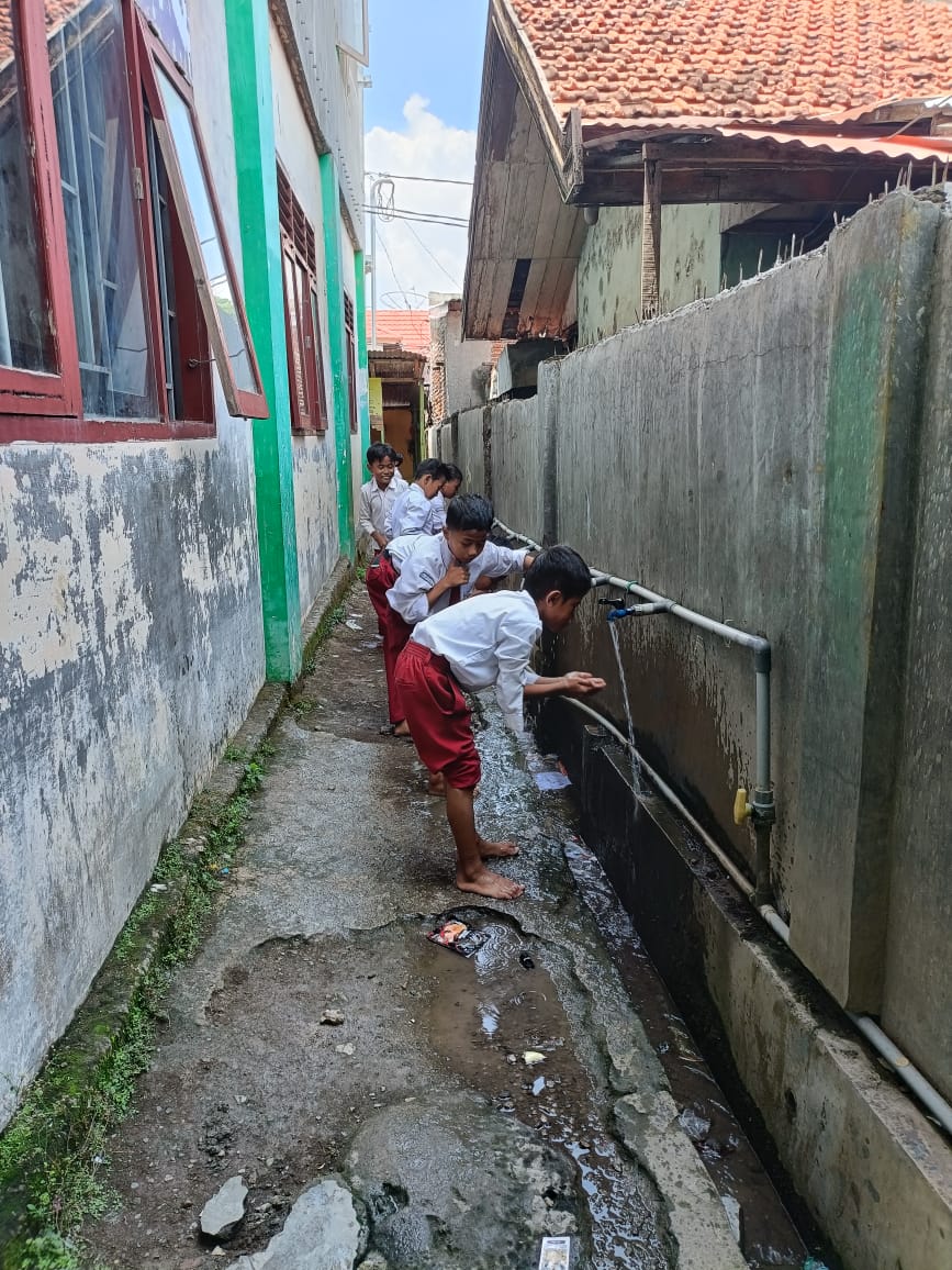 Siswa Kelas 3 SDN 21 Tolomundu Kota Bima Mengambil Air Wudhu untuk Sholat Dzuhur Berjamaah