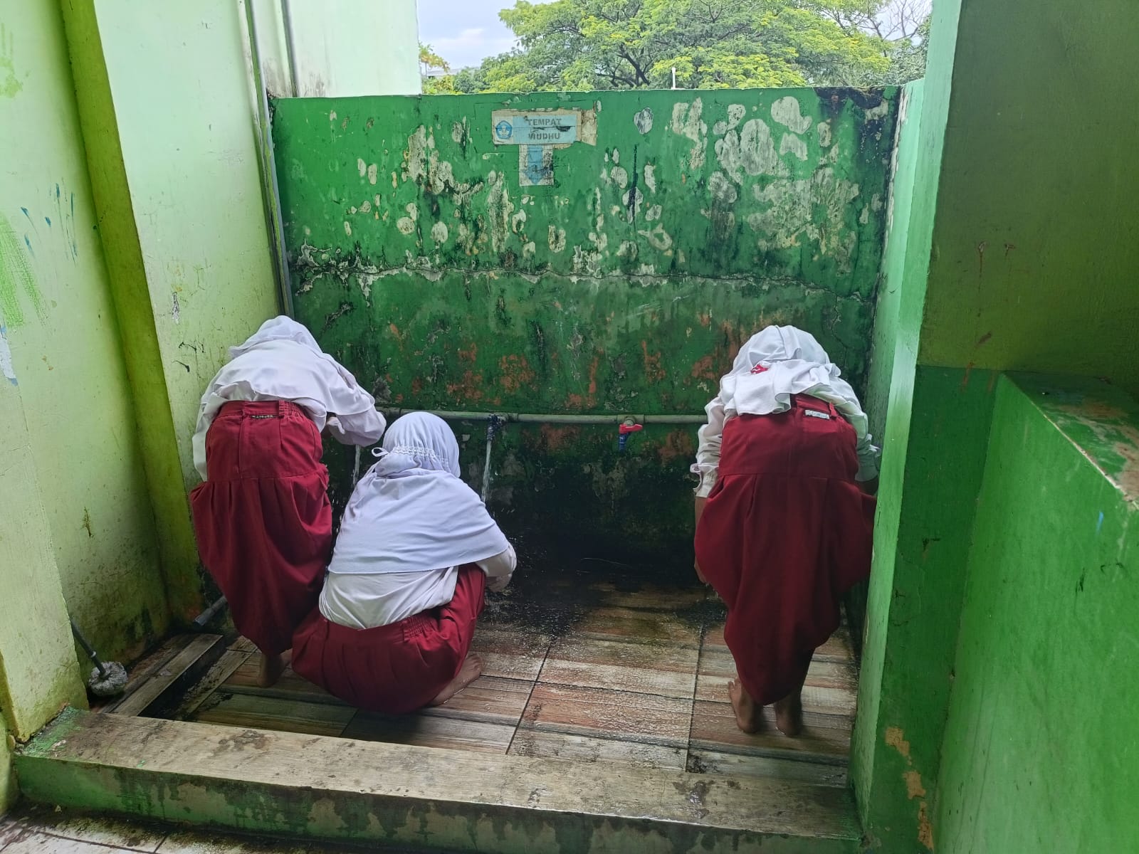 Siswa Kelas 4 Mengambil Air Wudhu untuk Sholat Dzuhur Berjamaah di Mushola